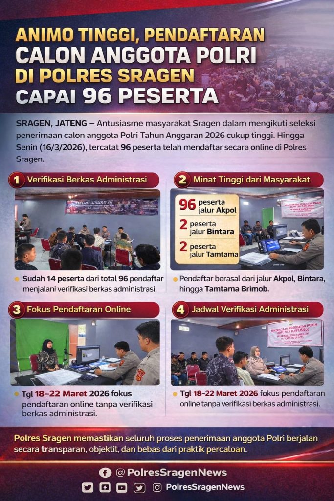 Polres Sragen sendiri memastikan seluruh proses penerimaan anggota Polri dilaksanakan secara transparan, objektif, akuntabel, dan bebas dari praktik percaloan, sejalan dengan komitmen reformasi birokrasi Polri dalam mewujudkan rekrutmen yang bersih dan berintegritas.