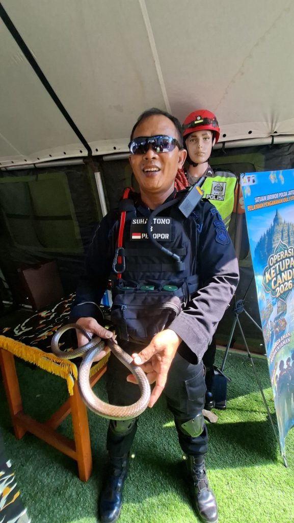 Polda Jateng, Kota Semarang,Monitor- online.my.id — Suasana Posko di Gerbang Tol Kalikangkung mendadak berubah tegang. Seekor ular dengan panjang sekitar satu setengah meter tiba-tiba muncul dan masuk ke area posko, memicu kepanikan sejumlah petugas yang tengah bertugas mengamankan arus mudik masyarakat.