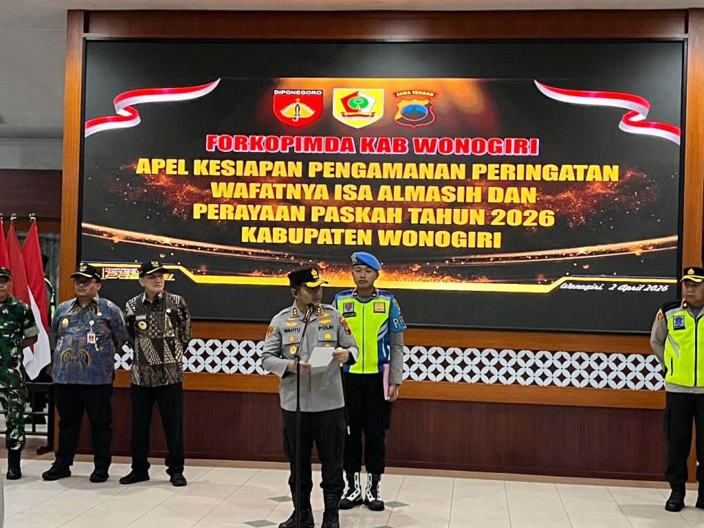 Wonogiri,Monitor- online.my.id – Polres Wonogiri menggelar apel kesiapan pengamanan peringatan wafatnya Isa Almasih dan perayaan Paskah Tahun 2026 di Pendopo Rumah Dinas Bupati Wonogiri, Kamis sore (2/4/2026).