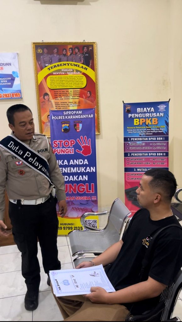 Karanganyar Monitor Online.My.Id — Satlantas Polres Karanganyar kembali melaksanakan kegiatan Polantas Menyapa di Satlantas Karanganyar pada Senin (6 April 2026) sebagai upaya meningkatkan kualitas pelayanan publik, khususnya dalam pengurusan Buku Pemilik Kendaraan Bermotor (BPKB).
