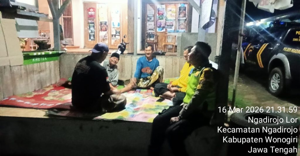 Wonogiri,Monitor-online.my.id- – Personel Bhabinkamtibmas Polsek Ngadirojo Polres Wonogiri melaksanakan kegiatan sambang dan pembinaan kepada masyarakat di pos keamanan lingkungan (pos kamling) di wilayah Kecamatan Ngadirojo, Kabupaten Wonogiri, Senin (16/3/2026) malam.